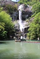 沿著石階,一個(gè)峰回路轉(zhuǎn)就到了龍吟潭邊,抬頭就會看到瀑布從90米高的懸崖上瀉入龍吟潭。站在壩上,撲面迎來一股涼爽的水汽。龍吟潭底建有水底龍宮,供人游覽,游玩龍宮出來后就坐小木船入洞游覽勝景。看了瀑布底下的5個(gè)小洞,船就進(jìn)入冬暖夏涼的龍游洞,一到洞內(nèi)碼頭,就看到洞內(nèi)的巨大洞窟,不看路標(biāo)說不定還會繞暈?zāi),游了水簾洞,盤龍瀑就進(jìn)入臥龍?zhí),靠著巖壁入洞中,盤繞上有33米高的圓壁樓梯就是懸空洞,從梯頭拍洞景,往下拍像玫瑰花,向前拍像洞中長廊,洞中倆旁洞室相連,有人防洞,會議廳,餐廳,廁所,廚房和洞宇文化宣傳窗。